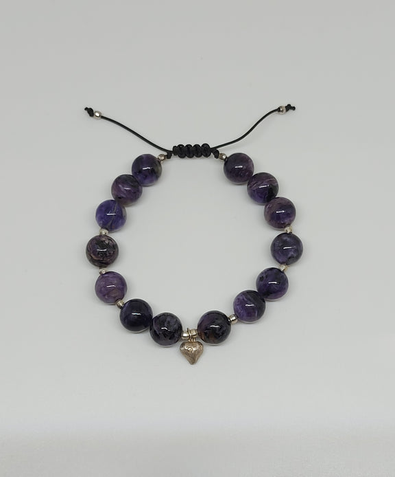 A stunning drawstring beaded bracelet, the beads are stunning Charoite beads a beautiful purple stone with a pearly lustre, which are threaded onto Black cord. It features silver beads between each sun stone bead and has a little sterling silver heart charm with a flush set Diamond