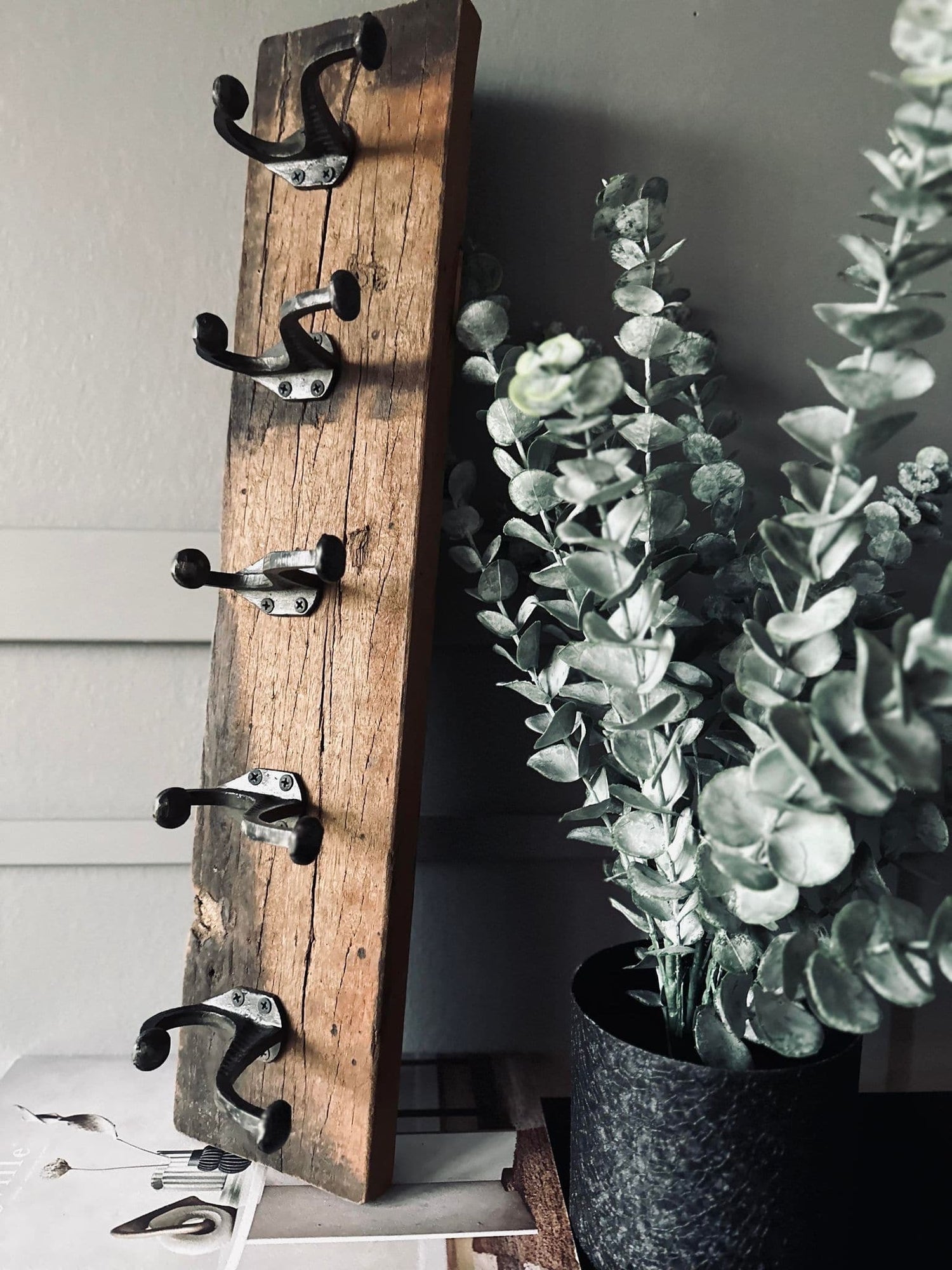 Rustic and strong coat rack with 5 hooks. The wood is reclaimed wood.