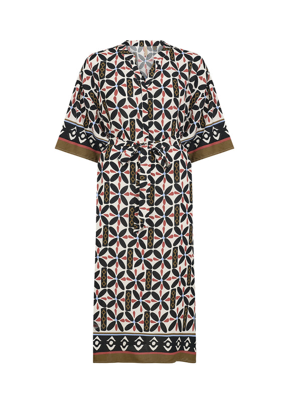 SC-SANDRA 3 Dress is crafted from 100% LENZING™ ECOVERO™ Viscose. It features a geometric print, a V-neckline, and a waist tie for a flattering fit. Pair it with sandals or sneakers for a relaxed look.